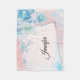 Cobertura com lindas flores azuis sobre fundo rosa. Uma imagem de uma página de notebook em forma de retângulo colocada sobre cima para que você escreva seu dentro de texto.