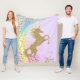 Um cobertor de Unicórnio com um belo unicórnio dourado sobre um fundo de arco-íris roxo, lavanda pastel. Este bonito cobertor unicórnio é facilmente personalizado simplesmente adicionando o texto de sua escolha no estilo de fonte preferido. Você também pode mudar a cor de fundo neste adorável cobertor unicórnio. Este é um design impresso sem brilho real, folha de alumínio, etc.