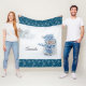 Um cobertor com uma fotografia fofa de um pequeno boneco de neve. Lá fora, no inverno, com neve caindo por toda parte. Esta cara bonita está vestida de chapéu azul e cachecol. Padrão de flocos de neve com um fundo azul escuro ao longo da borda superior e inferior.