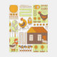 Galo e duas galinhas, ovos, flores, casa, desenhando sobre fundo branco. Padrão geométrico, abstrato, desenhado à mão, colheita