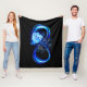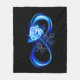 Luminous infinity symbol with glowing, beautiful, lushly blooming rose made of blue flames on black background.