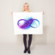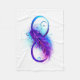 Símbolo infinito com uma bela pena pintada em cores roxas e azuis brilhantes sobre fundo branco.