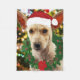 Uma pintura digital de um filhote pronto para o Natal com uma coroa, chapéu de Papai Noel e uma árvore decorada.