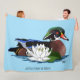 Pato de madeira na água com um lenço de água branco ao lado do pato num pano de fundo de azul