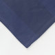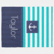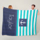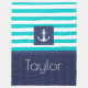 Cobertura náutica de velo com padrão listrado azul-turquesa e marinho e texto personalizável.