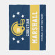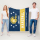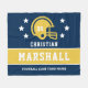 Um cobertor personalizado de futebol temido de velo para jogadores quando eles não estão marcando touchdowns no campo, e para seus pais apoiarem seus filhos e ficarem quentes em jogos infantis! Faz um presente de equipe único. Design apresenta um capacete de futebol personalizado com o número uniforme do jogador, texto personalizado para o primeiro e sobrenome do jogador e texto moderno para o nome da equipe. Na moda e design moderno apresentam letras de camisa de varsity esportivas e faixas simples horizontais com sotaques estelares. O esquema de cores de azul marinho, amarelo-milho e branco pode ser modificado para se coordenar com as cores de sua equipe.