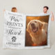 Um cobertor de pulseira de cão de estimação com uma foto tesourada do seu querido cão, um fundo de mármore branco moderno, uma pata com coração, uma citação de lembrança de simpatia que diz "você deixou suas pegadas para sempre em meu coração", mais seu nome, e datas.