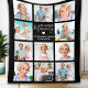 Folheto de colagem de fotos em um elegante design branco e preto. Citação: " Na Memória Adorável." Este cobertor de memória apresenta 11 das suas fotos e nome favoritos. COPYRIGHT © 2020 Judy Burrows, Black Dog Art - Todos Os Direitos Reservados. No Loving Memory 11 Photo Collage Memorial Fleece Blanket