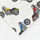 O teste padrão conhecido feito sob encomenda moderno e na moda das motocicletas dos desenhos animados com as bicicletas coloridas em vermelho, em verde, em azul e em amarelo com fundo branco e com uma listra cinzenta preta personalizada apenas adiciona seus presentes conhecidos ou presentes do monograma ou suas iniciais para um presente original. As melhores ideias do presente da motocicleta para homens e meninos e meninas.