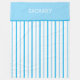 Borda azul-céu sólida com o nome da criança em tipografia branca. Listras verticais geométricas verticais azuis e de dois tons pastel sobre fundo branco. Design original de TamiraZDescartazes.