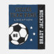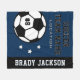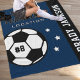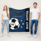 O cobertor personalizado do futebol temido pula para jogadores de futebol quando eles não estão marcando gols no campo, e para os pais apoiarem seus filhos e ficarem quentes em jogos frios! Faz um presente de equipe único para torneios de viagem. Design apresenta uma bola de futebol personalizada com o número uniforme do jogador, texto personalizado para o primeiro e sobrenome do jogador e texto moderno para o nome da equipe do clube de futebol. Na moda e design moderno apresentam letras de camisa de varsity esportivas e faixas simples horizontais com sotaques estelares. O esquema de cores de azul, preto e branco do Marinho pode ser modificado para coordenar com as cores da sua equipe.