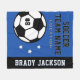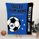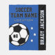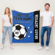 O cobertor personalizado do futebol temido pula para jogadores de futebol quando eles não estão marcando gols no campo, e para os pais apoiarem seus filhos e ficarem quentes em jogos frios! Faz um presente de equipe único para torneios de viagem. Design apresenta uma bola de futebol personalizada com o número uniforme do jogador, texto personalizado para o primeiro e sobrenome do jogador e texto moderno para o nome da equipe do clube de futebol. Na moda e design moderno apresentam letras de camisa de varsity esportivas e faixas simples horizontais com sotaques estelares. O esquema de cores do azul real, preto e branco pode ser modificado para se coordenar com as cores de sua equipe.