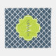 Um cobertor de velo azul de quatrefoil marinho elegante, com um crachá escalpado em um verde primavera vibrante que você pode personalizar adicionando seu nome e monogramando inicialmente. Esta é parte da Coleção de Primaveras de Perfuração Azul e Limão. Escolha entre três tamanhos.