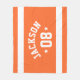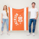 O cobertor personalizado da frota esportiva para atletas apresenta um primeiro ou sobrenome em cartazes esportivos curvos junto com um número de equipe. Largas faixas horizontais e estrelas acentuam este design simples e na moda. O esquema de cores de laranja e branco pode ser modificado para coordenar com as cores do seu clube ou escola.