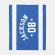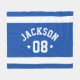 O cobertor personalizado da frota esportiva para atletas apresenta um primeiro ou sobrenome em cartazes esportivos curvos junto com um número de equipe. Largas faixas horizontais e estrelas acentuam este design simples e na moda. O esquema de cores do azul real e do branco pode ser modificado para coordenar com as cores do clube ou da escola.