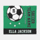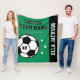 O cobertor personalizado do futebol temido pula para jogadores de futebol quando eles não estão marcando gols no campo, e para os pais apoiarem seus filhos e ficarem quentes em jogos frios! Faz um presente de equipe único para torneios de viagem. Design apresenta uma bola de futebol personalizada com o número uniforme do jogador, texto personalizado para o primeiro e sobrenome do jogador e texto moderno para o nome da equipe do clube de futebol. Na moda e design moderno apresentam letras de camisa de varsity esportivas e faixas simples horizontais com sotaques estelares. O esquema de cores de verde, preto e branco pode ser modificado para coordenar com as cores de sua equipe.