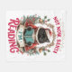 A fun and cheerful Christmas holiday design showcases a black cat dressed in a red cape and a white turtleneck sweater, engrossed in reading a book. The cat sits in front of fern and holly branches, under a golden arch adorned with bells. The colorful text reads, "Not now Santa, I'm reading." This design is available on various products that make perfect gifts for book lovers.