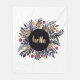A ilustração é feita com aquarelas e guaches no papel. Indigo, ostro e folhagem laranja e flores com uma mão escrita como olá de ouro no meio.