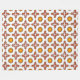 Towel set with a pattern of orange and yellow sunflowers alongside red geometric crosses, hanging on a metal bar; matching washcloth laid flat.