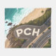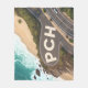 This stylized aerial illustration captures the iconic Pacific Coast Highway as it curves along the coastline, blending natural beauty with graphic creativity. The winding road forms bold “PCH” lettering directly within the composition, guiding the eye through turquoise ocean waves, sunlit sand, and lush coastal hills. With a cinematic perspective, clean lines, and vibrant coastal tones, this artwork celebrates travel, movement, and the timeless allure of California’s most famous highway.