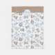 Este cobertor de velo apresenta um padrão fofo de animais da selva de bebês, incluindo um leão, um macaco, um elefante, um urso panda, e um hipopótamo. As cores predominantes no padrão são castanho macio e azul-bebê. No topo está uma borda de bolinhas castanha e branca com um banner de círculo azul claro correspondente que mantém o nome do seu filho em castanho.
