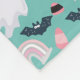 Um padrão perfeito para o Dia das Bruxas, com fantasmas sorridentes, arco-íris pastel, milho doce, morcegos, abóboras, estrelas e chapéus de bruxa em um fundo aqua teal. A design combina doce e assustador com uma paleta de cor pastel moderna, rosa, branca, preta e pêssego, fazer perfeito para o decor de Halloween infantil