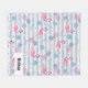 Um cobertor com um padrão com uma vibração alegre. flamingos e abacaxis cor-de-rosa, colocados sobre um padrão listrado azul claro com folhas e corações ao redor.