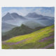 Um campo verde e luxuoso cheio de flores silvestres roxas vibrantes se estende através do primeiro plano sob um céu azul brilhante. Montanhas misteriosas sobem majestamente ao fundo, criando uma paisagem serena e tranquila.