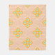 Hexagonal floral pattern with blue-green centers and orange outlines on a peach background. White lines connect the shapes, creating a geometric grid.