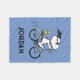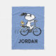 Pedal into personalized comfort and classic charm with this adorable blue fleece blanket, featuring Snoopy and Woodstock on a bicycle, ready for your custom touch! This soft and warm blanket showcases a delightful line-art illustration of Snoopy, wearing sunglasses, happily riding a vintage-style blue bicycle with Woodstock perched safely behind him. The dashed lines behind the back wheel suggest motion, adding to the playful scene, all set against a cheerful light blue background. Below the illustration, there's a space for a personalized name, allowing you to create a unique and special item for anyone. This iconic and heartwarming design brings a sense of nostalgic joy and timeless appeal. Perfect for snuggling on the couch, picnics, or as a thoughtful personalized gift, this blanket is a must-have for any Peanuts fan!