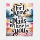 Uma ilustração serena e espiritual do texto "Pois eu conheço os planos que tenho para você" em uma caligrafia elegante e ousada. A frase é lindamente cercada por campos de aquarela cor de rosa, laranja e azul, se misturando harmoniosamente. Um sol suave ilumina o fundo, lançando um brilho pacífico sobre a cena. personalizado com o nome.