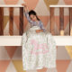 Pretty pink rocking horse with shades of pink and purple next to fun flowers