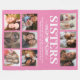 Cute personalized sister blanket featuring a pretty pink background that can be changed to any color, 9 square pictures, and a sweet family sister quote.