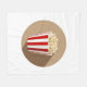 Pipoca em uma banheira vermelha e branca listrada clássica com um fundo circular marrom. A pipoca parece saborosa para ser comida ao assistir a um filme. Pode ser uma boa design para usar no seu cobertor, especialmente se você gosta de pipoca também!
