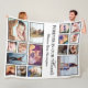 Um cobertor de velo personalizado com um simples fundo branco que pode ser mudado para qualquer cor, uma colagem de 16 fotos, o ditado "para sempre em nossos corações", e seu nome.