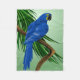 A arte azul do papagaio que caracteriza um Macaw do jacinto empoleirou-se no ramo com grandes folhas de palmeira no fundo