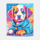 Design de arte colorida e fofa de um filhote vestindo um casaco azul (Este Design feito com IA). Faça a ordem hoje e encare a alegria de Comprar!