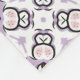 "Two images featuring a towel and washcloth with a repeating geometric floral pattern in purple and black. The towel is displayed hanging on a rod, and the washcloth is laid flat with a corner folded. The pattern conveys an elegant, decorative tone."