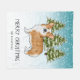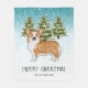 A ilustração original do desenho animado de Destei de um cão da raça Pembroke Welsh Corgi, de cor vermelha e branca, de casaco. O cão é colocado numa cena de inverno com três árvores de abeto verde e neve caindo. O fundo é um gradiente azul a branco que dá à design aquele olhar frio do dia de inverno. Há também uma área de texto personalizável que diz agora "Feliz Natal!". Sob ela, há outra área de texto personalizável para um nome de família ou outro texto personalizado.