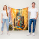 This 1960s inspired sunset scene features a colorful glowing sky with waves gently rolling onto the beach as the sun dips below the horizon. Complete with a painted hippie travel van, surfboards and guitar. The only thing missing is you! Made for beach bums, surfers, travelers, dreamers, and anyone who feels most alive chasing the next horizon. Show off your love for coastal life and vintage vibes with this groovy fleece throw blanket. Perfect for beach house decor, surf shacks and any space that needs a touch of the coast. | Matching throw pillow available in store.