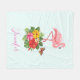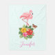 Um cobertor com uma ilustração digital fofinha apresentando um flamingo rosa com uma perna erguida. Em pé sobre um buquê de flores e folhas de hibisco tropicais. Uma borboleta bonito está pairando ao redor das flores. Um padrão verde-claro e de fêmur branco no fundo.