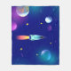 O Foguete do Foguete Blanket está se espalhando pelo espaço e a terra está agora à distância. As cores do cobertor são azuis, laranja, roxo.