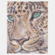 Uma pose pacífica de um leopardo que olha sonhadamente para a distância. Seus olhos são verdes em vez da cor amarelada habitual. A boca fechada está relaxada. A perfeita criatura guardiã para se sentir protegida durante o sono. Reprodução de um desenho a lápis colorido pela artista Joyce Jackson.