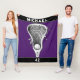Cobertura personalizada de presentes de lacrosse com design de pau e bola em fundo roxo. Editar texto para adicionar o nome do jogador de lax e o número do grupo.