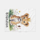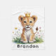 Uma ilustração aquosa de um filhote de leão bonitinho sentado num campo de flores silvestres. O filhote de leão tem pelo ouro-laranja com manchas brancas no peito e patas, grandes olhos castanhos expressivos e uma expressão sorridente feliz. Uma coroa ouro senta-se sobre a cabeça. As orelhas do filhote são tocadas para cima e sua cauda é amassada para cima. O fundo apresenta uma variedade de flores silvestres coloridas, incluindo margaridas amarelas, flores roxas e cor-de-rosa e pedúnculos de grama verde. As flores estão espalhadas pela parte inferior da ilustração. O trabalho de arte tem um estilo macio e caprichoso com texturas aquáticas sutis e sutil sombreamento. Toda a ilustração é colocada sobre um fundo branco sem borda.