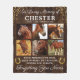 Folheto personalizado com foto de cavalo, com 6 fotos preciosos do seu amado animal de estimação, um fundo de madeira rústico, ferraduras de ouro e brilho, o texto "em memória amorosa de", seu nome de cavalo, datas de nascimento/morte, e a frase de simpatia "sua presença nós perdemos, sua memória que nós valorizamos, amando você sempre, esquecendo você nunca".