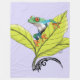 Um Sapo de Árvore Vermelha giro se senta sobre três folhas contra um pano de fundo roxo claro