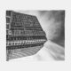 A towering building rises from the city against a stark black-and-white sky, its sharp lines and geometric forms commanding attention. A lone bird flies past, its small silhouette contrasting with the structure’s massive presence, adding a fleeting sense of life to the bleak metropolis.