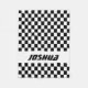 O cobertor de velo personalizado legal tem um design de sinalizador de verificador preto e branco na frente. Personalize mudando o nome para o que quiser. Isso seria um presente excelente para o entusiasta do carro de corrida em sua vida. Consulte os nossos outros itens de sinalizador de verificador personalizados.