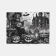 Uma ilustração preta e branca assustadora de uma bruxa esquelética com suas abóboras.